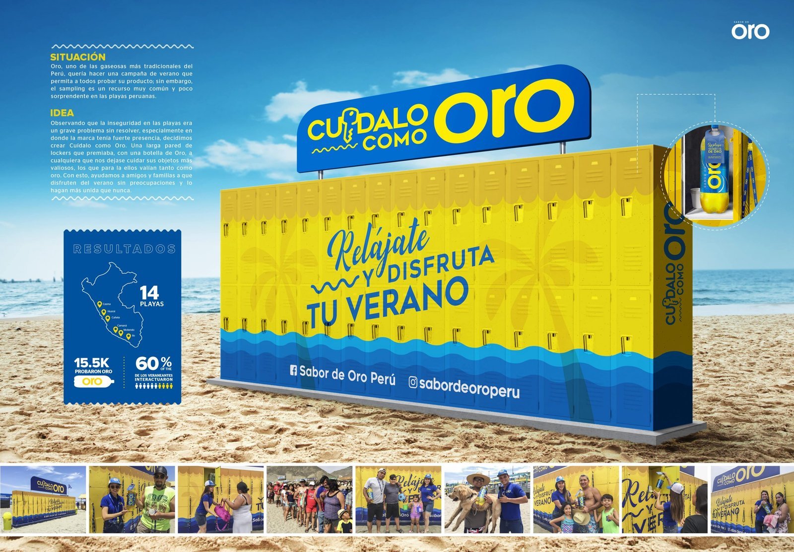Oro es una de las gaseosas más tradicionales del mercado peruano, y en el verano quiso seguir refrescando a su público con una activación de sampling. En ese camino descubrimos un problema muy fuerte en las playas peruanas: la inseguridad. Los peruanos suelen ir a relajarse con un gran equipaje, pero el peligro de perderlo impedía que disfrutaran al máximo este momento, incluso los hacía dividirse para que alguien siempre estuviera cuidando la sombrilla y su equipaje. Así fue como nació Cuídalo como Oro. Una pared de más de 50 lockers para guardar en ellos los objetos más preciados de cada familia a cambio de recibir una botella de Oro para que la compartieran en grupo. Logramos grandes resultados, pero el mejor fue ayudar a que nuestro público se despreocupe y disfrute unido del verano.