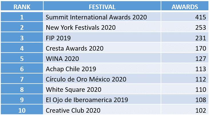 Los siguientes festivales analizados, son los que más premios entregaron a las agencias independientes. Cabe resaltar que hay festivales locales y de agremiaciones en la lista, además festivales especializados; otros como Cannes no aparecen, porque no pudieron realizarse este año.