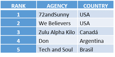 A pesar de vivir el año más difícil para la historia de la publicidad, Latinoamérica siguió creyendo en la visibilidad de los festivales. Demostrando, una vez más, que el protagonismo latino se está tomando al mundo con grandes casos, como los multiplemente premiados de Don (Argentina) y Tech and Soul (Brasil) que les valieron para ocupar la posición #4 y #5 respectivamente en el top de las américas que fue liderado por las agencias estadounidenses 72andSunny y Webelievers.