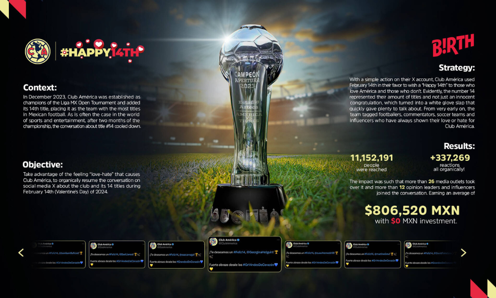 Para devolverlo a la conversación pública, Birth Group creó una idea tan simple como efectiva: aprovechar el 14 de febrero para lanzar, desde la cuenta oficial del club en X, un mensaje que decía “Feliz 14”. Aunque a primera vista parecía una felicitación por San Valentín, el mensaje también hacía referencia a los 14 títulos del equipo. Esa doble lectura, dirigida tanto a quienes aman al América como a quienes no, reactivó el orgullo azulcrema y generó conversación inmediata. La publicación se potenció al etiquetar a futbolistas, medios y figuras que han expresado amor u odio por el club, logrando una ola de reacciones orgánicas en redes sociales.