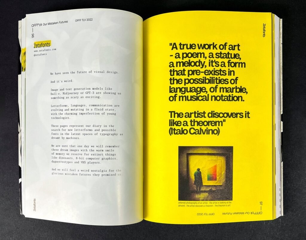 In May 2022 the Italian independent type foundry Zetafonts was contacted by Nitsan Rozenberg and Liri Argov, co-directors of OFFF TLV, the Tel Aviv branch of the worldwide famous OFFF Festival, to design an event catalog for the 2022 edition of this festival, dedicated to the post-digital creation culture.