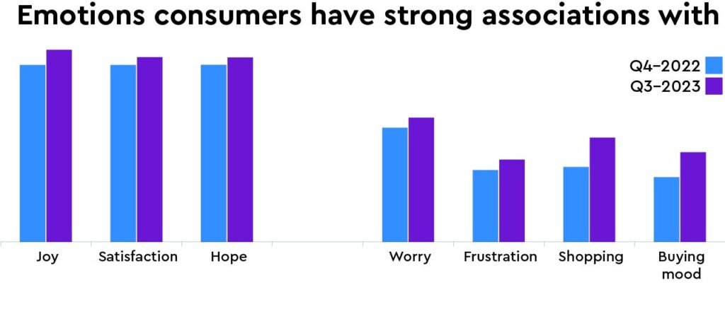 The responses to these prompts, measured on a scale from e.g., ‘totally disagree’ to ‘totally agree’, show a clear picture of consumer behaviour, right? We believe that the answer is not that clear. Yes, such worries are relevant, and many brands have faced challenges regarding declining spend. However, our findings show a differentiated range of consumer behaviour. In particular, emotions appear to be affected very differently (compared with the surface-level perception of crises) and thus should be considered as well.