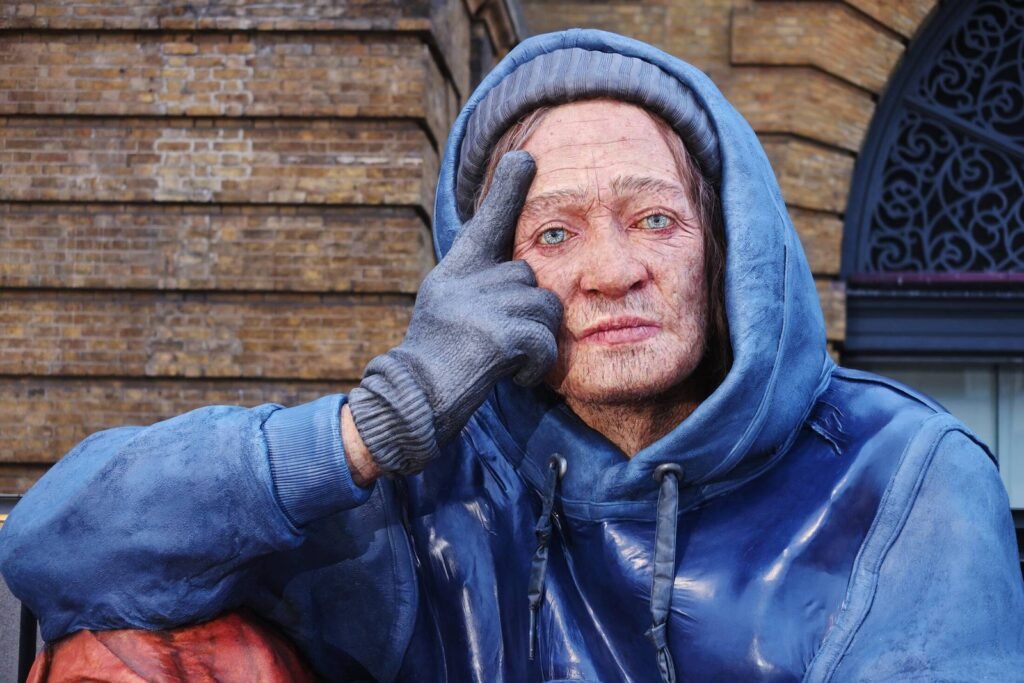 A towering, hyper-realistic sculpture of a person experiencing homelessness has appeared today at London’s Kings Cross station. The colossal 4.3-metre-tall sculpture, created by hyper realism artist Sophie de Oliveria Barata, working with Creative Giants, stands as a visible testament to the hundreds of thousands of people currently experiencing the most acute kinds of homelessness.