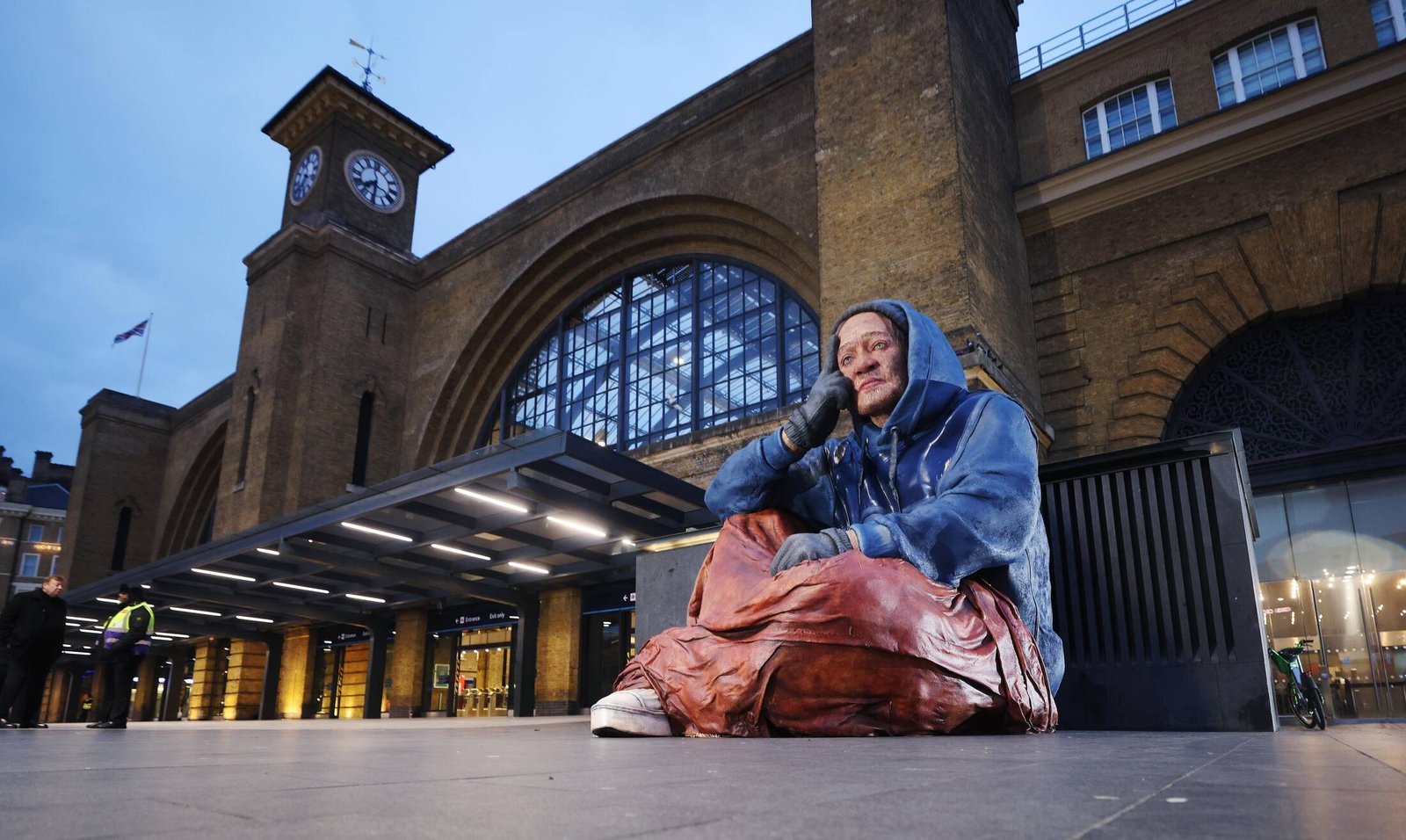 A giant, hyper-real sculpture of a person experiencing homelessness is revealed at London King’s Cross station, with the powerful protest coming after new research revealed 300,000 households could be left homeless next year