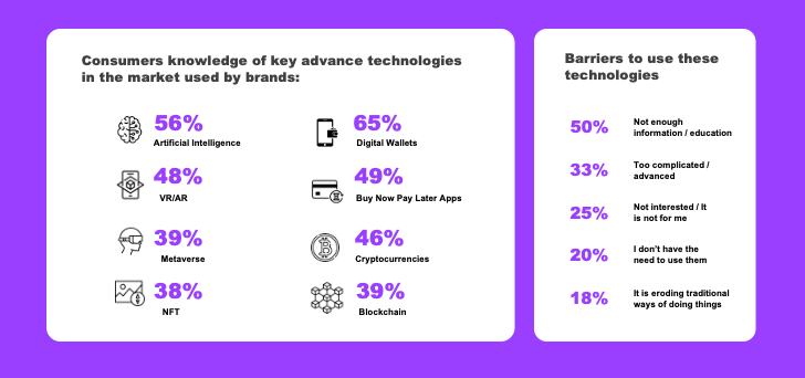 The main barriers to using advance technologies are not having enough information or education (50%) followed by being too complicated or advanced for them (33%), butalso there are ethical concerns with 68% saying these technologies should be regulated to avoid misuse and harmful practices.