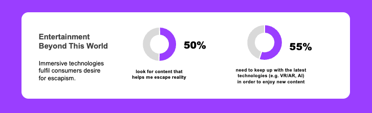 There’s a desire for escapism from troubling realities and the market providing these experiences will continue to grow – 50% say they look for content that helps me escape reality, and consumers are recognising that entertainment using immersive technologies can provide this escapism.