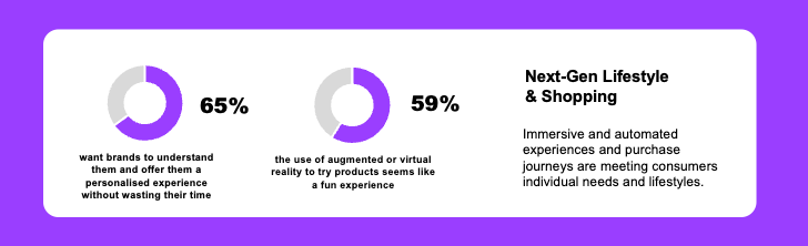 Virtual technologies are enabling people to meet their rising demand for experiential engagement – the use of augmented or virtual reality to try products seems like a fun experience (59%), the idea of using VR to experience different destinations is appealing (58%), the idea of using AR to try different clothes will save me time (56%).