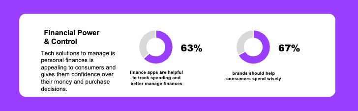 As digital wallets are increasing in popularity (54% use their digital wallet more than their physical wallet) consumers are willing to embrace other financial solutions driven by digital tech to have more control over their money with 63% saying finance apps are helpful to track spending and better manage finances.