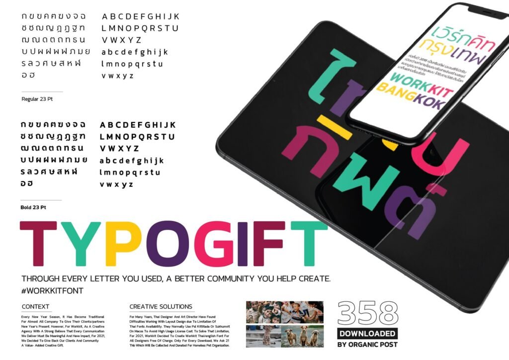 Thousand of Likes and Shares on Social media by organic 358 download clicks mean we can feed Stray Dogs and Cats with 358 meals. Typogift font has been used as the standard font for the Ministry of Energy, Thailand, and more.