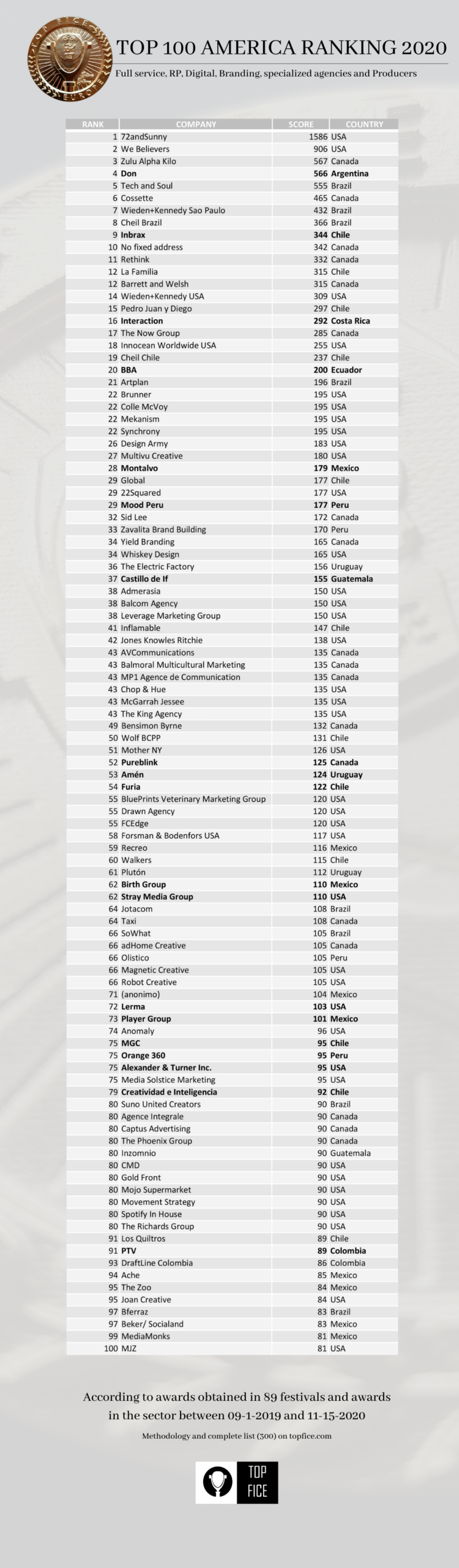 Sin lugar a dudas 72andSunny de Estados Unidos (1586 puntos), se consolida como la agencia independiente más creativa del continente americano, según la revisión realizada por TopFICE a 89 festivales internacionales realizados entre el 1 de septiembre del 2019 y el 15 de noviembre del 2020. Por Suramérica la agencia del año fue DON de Buenos Aires (Argentina) con 566 puntos, que se ubicó además en un destacadísimo cuarto lugar del ranking general americano. Finalmente, la agencia centroamericana más destacada fue Interaction de Costa Rica en la posición 16 con 292 puntos.