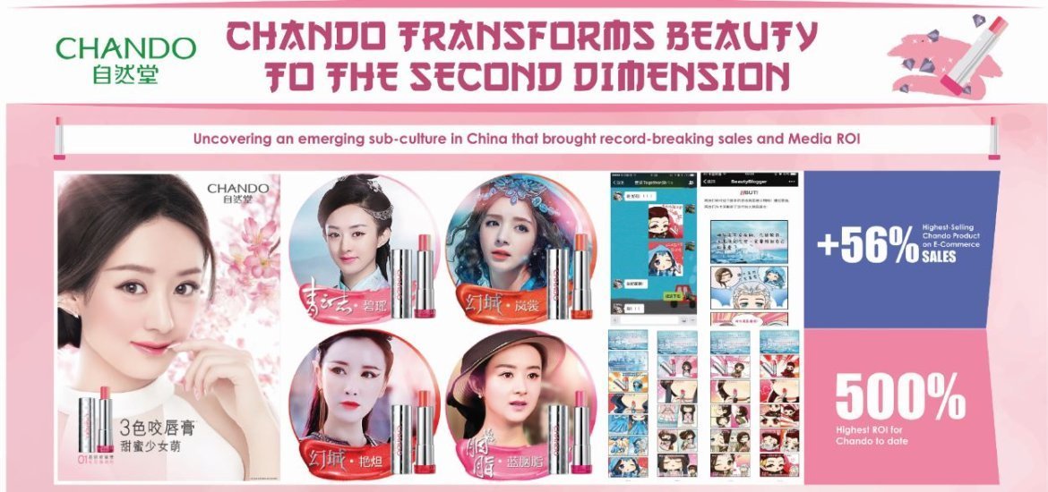 Chando is going after trendsetter millennials who like experimenting. What we uncovered is that these millennials tend to be serial role-changers who like to transform into a digital persona swiftly using make-up, depicting a desire to expand into a wider dimension from their ordinary lives. We call this phenomenon –the second dimension. This eventually gave rise to an emerging sub-culture of ACGN (animation, comic, gaming and novel). This role-playing obsession is also fuelled by e-gaming and many big TV drama shows. We created a game-changing strategy by creating a seamless and unified idea of ‘Adorable Princess of The Second Dimension’, using Chando’s brand endorser Zhao Li Ying. We created four second-dimension characters to represent Sweet Gradient’s four lipstick variants on TV, gaming and online.
