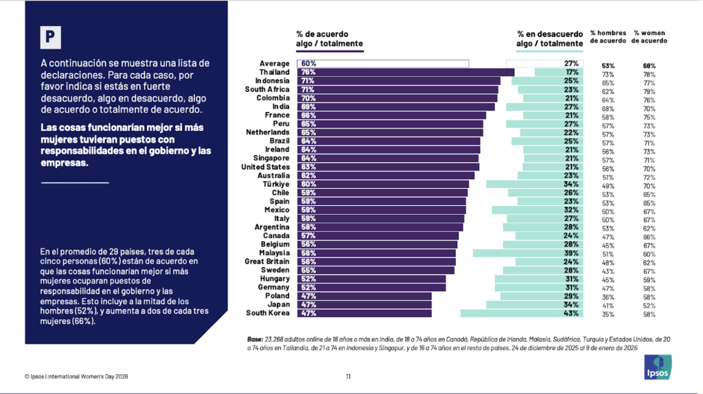 En paralelo, el 60% en el promedio global considera que las cosas funcionarán mejor si más mujeres ocuparan puestos de responsabilidad en el gobierno y las empresas. Este porcentaje incluye al 66% de las mujeres y al 52% de los hombres. Asimismo, el 54% cree que las mujeres no lograrán igualdad con los hombres en su país a menos que haya más mujeres en cargos de liderazgo en empresas y gobierno, con un nivel de acuerdo mayor entre mujeres (60%) que entre hombres (47%).