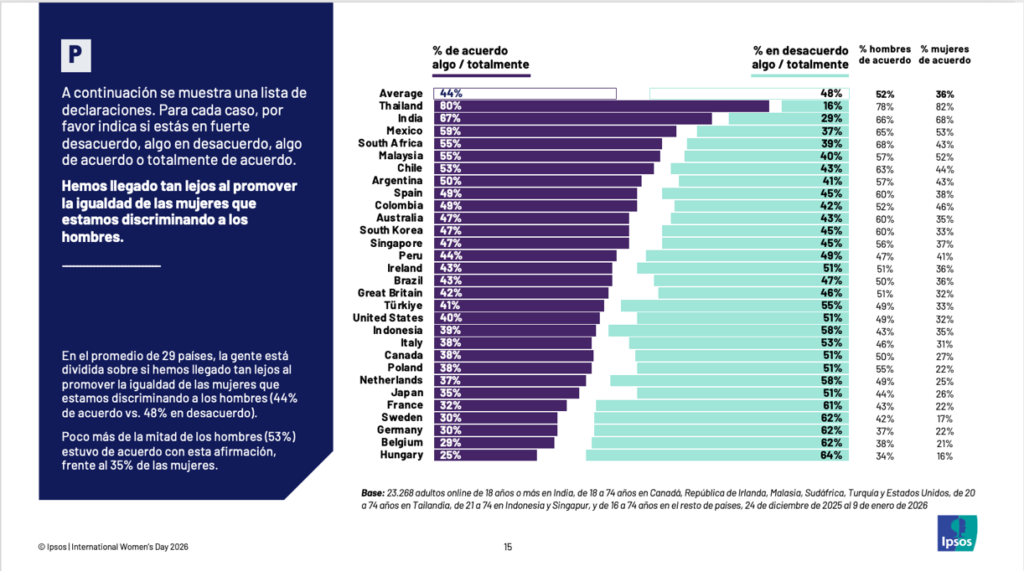 Uno de los principales hallazgos muestra que, en el promedio de los 29 países, el 52% está de acuerdo en que, cuando se trata de otorgar a las mujeres los mismos derechos que a los hombres, las cosas han avanzado lo suficiente en su país. Esta percepción no es uniforme: el 55% de los hombres coincide con esta afirmación, frente al 44% de las mujeres. En todos los grupos de edad relevados, los hombres son más propensos que las mujeres a considerar que se ha hecho lo suficiente en materia de igualdad de derechos.