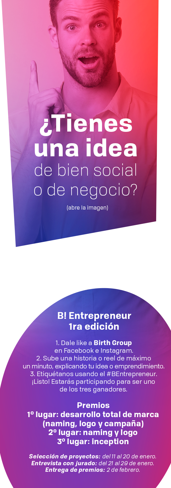Se buscan emprendedores de todo México que quieran trabajar muy duro en el desarrollo integral de su proyecto y Birth Group regalará elementos de branding que podrán usar en su estrategia digital y tal vez de medios tradicionales.