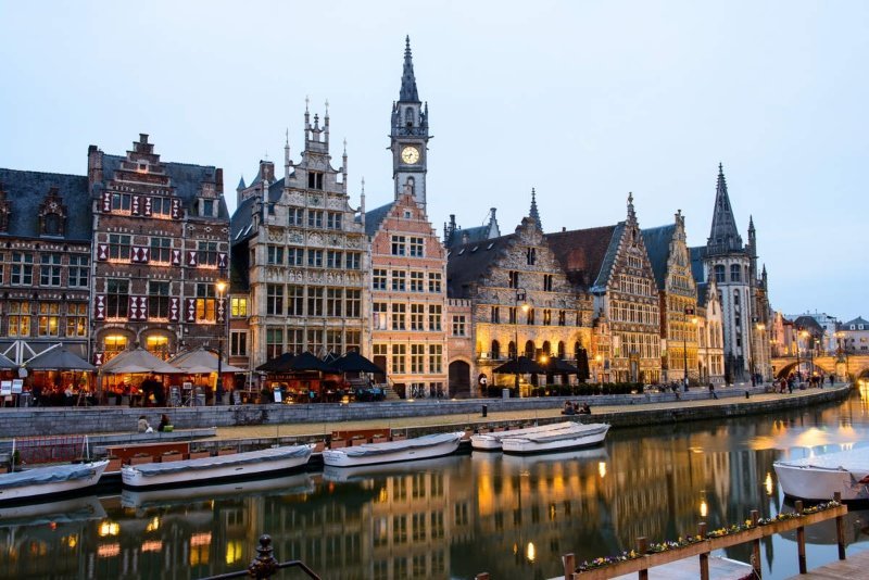 ¿Qué rincón podemos escoger para hacer la mejor foto de Gante al caer la noche? La respuesta es fácil: la ciudad entera. Gante ha recibido premios por la iluminación nocturna de sus monumentos, entre ellos uno otorgado por Phillips que algo sabe de luz. Los motivos para fotografiar en esa hora azul, que tan bien sienta a las fotos, son muchos: un campanario Patrimonio de la Humanidad, el castillo de los Condes de Flandes, la Antigua Lonja del Pescado o el puente de San Miguel, uno de los más populares. Mirando hacia el canal tenemos los antiguos muelles de Graslei y Korenlei; girando la vista a la derecha, aparecen las torres alineadas de la iglesia de San Nicolás, el Ayuntamiento y la catedral de San Bavón.