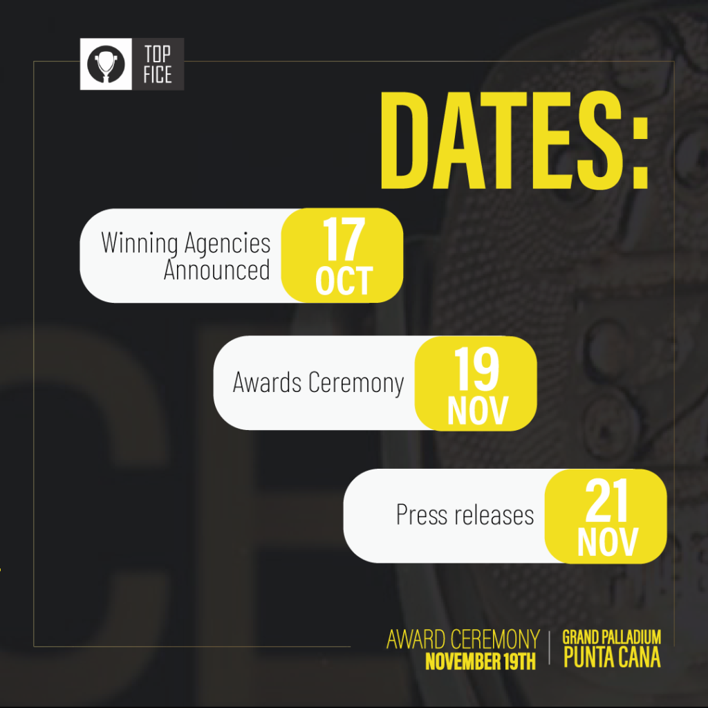 Este 19 de noviembre, desde las playas de Punta Cana, las industrias creativas y anunciantes podrán conocer a las agencias más premiadas, destacadas y reconocidas del año en esta nueva edición de TopFICE, la primera que tendrá premiación presencial. Con esta decisión, la organización de la cuarta edición del TopFICE busca que los mejores creativos, de las mejores agencias del año puedan encontrarse en un espacio paradisíaco que sirva como inspiración y recompensa por el mérito logrado en el último año.