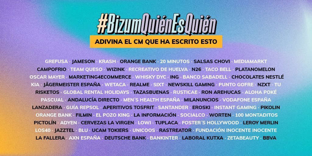 Más de 70 marcas, entre las que destacan Grefusa, Campofrío, BBVA, ING, Platanomelón,  KIA, Google, 20 Minutos o Banc Sabadell, se sumaron a una acción por la que se interesaron hasta 500 y que fue Trending Topic durante más de 8 horas. #BizumQuiénEsQuién consiguió más de 12,6 millones de alcance potencial, más de 5.000 usos del hashtag y 44.000 interacciones.
