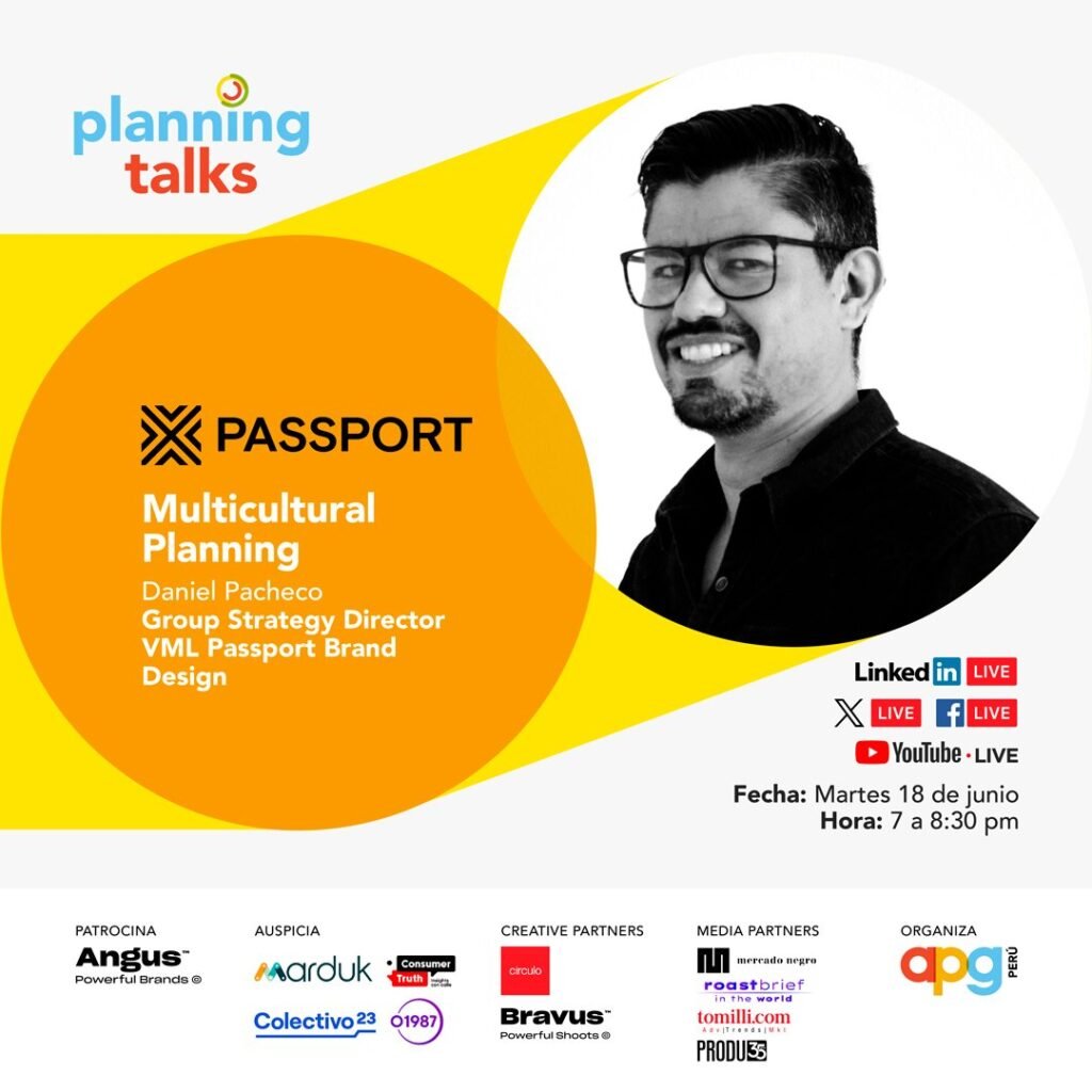 La edición #52 de los “Planning Talks” contó con la presencia de Daniel Pacheco, Group Strategy Director en VML Passport Brand Design, fue invitado internacional de la presente edición de los Planning Talks con la charla denominada: “Multicultural Planning”, la cual se realizó el pasado martes 18 de junio vía YouTube. Pacheco es Director de Estrategia en Passport VML, donde lidera la estrategia de marca para los negocios. Originario de Caracas, Venezuela, Daniel tiene años de experiencia estratégica en agencias tanto en América Latina como en Estados Unidos, trabajando en campañas de alto perfil para clientes como Molson Coors, Heineken, Sprint, Visa, Bayer, J&J, Ford, Kellogg’s y Kraft. Antes de unirse a Passport VML, Daniel fue director de estrategia creativa en Jack Morton en Chicago y también trabajó en agencias como J. Walter Thompson, McCann, BBDO, Rock the Agency y Alma DDB. Una de las mayores fortalezas de Daniel es su formación en psicología clínica, obtenida en la Universidad Católica Andrés Bello en Caracas. Hoy vive en Austin, TX, y en su tiempo libre disfruta de la música en vivo, la fotografía y el aire libre. Pueden seguirlo en su cuenta de LinkedIn: https://www.linkedin.com/in/daniel-pacheco-6890b415/