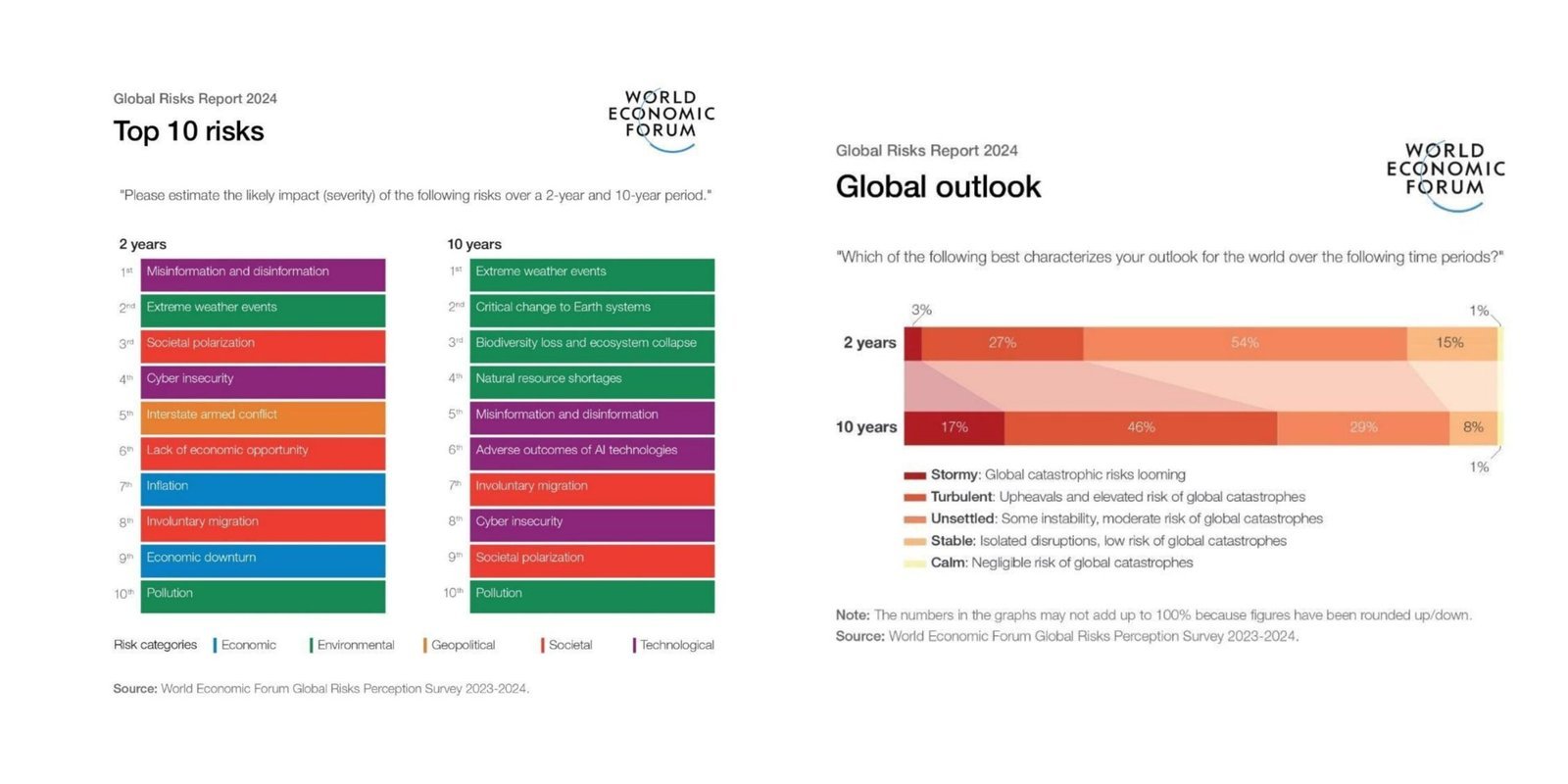 El informe, elaborado en colaboración con Zurich Insurance Group y Marsh McLennan, se basa en las opiniones de más de 1400 expertos en riesgos globales, políticos y líderes de la industria encuestados en septiembre de 2023. Los resultados destacan una perspectiva predominantemente negativa para el mundo a corto plazo que se espera que empeore a largo plazo. Si bien el 30% de los expertos globales esperan una alta probabilidad de catástrofes mundiales en los próximos dos años, casi dos tercios esperan que esto ocurra en los próximos 10 años.