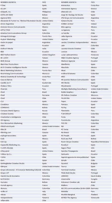De 48 países inscritos, 35 fueron los ganadores de los 5 continentes en WINA 2021. Europa tuvo una participación activa con agencias de España, Bélgica, Hungría, Bulgaria, Alemania, Reino Unido, Portugal, Francia, Bélgica, Rumania, Italia, Rusia y Grecia. América como siempre es protagonista con agencias ganadoras de Canadá, Argentina, Brasil, México, Colombia, Chile, Perú, Bolivia, Estados Unidos, Ecuador, Honduras, Paraguay, Panamá, Costa Rica, Rep. Dominicana, Guatemala y Puerto Rico. Oceanía, Asia y África tuvieron sus cuotas en el shortlist con Australia, Tailandia, Filipinas, Arabia Saudita, Emiratos Árabes Unidos, Marruecos y Taiwán.