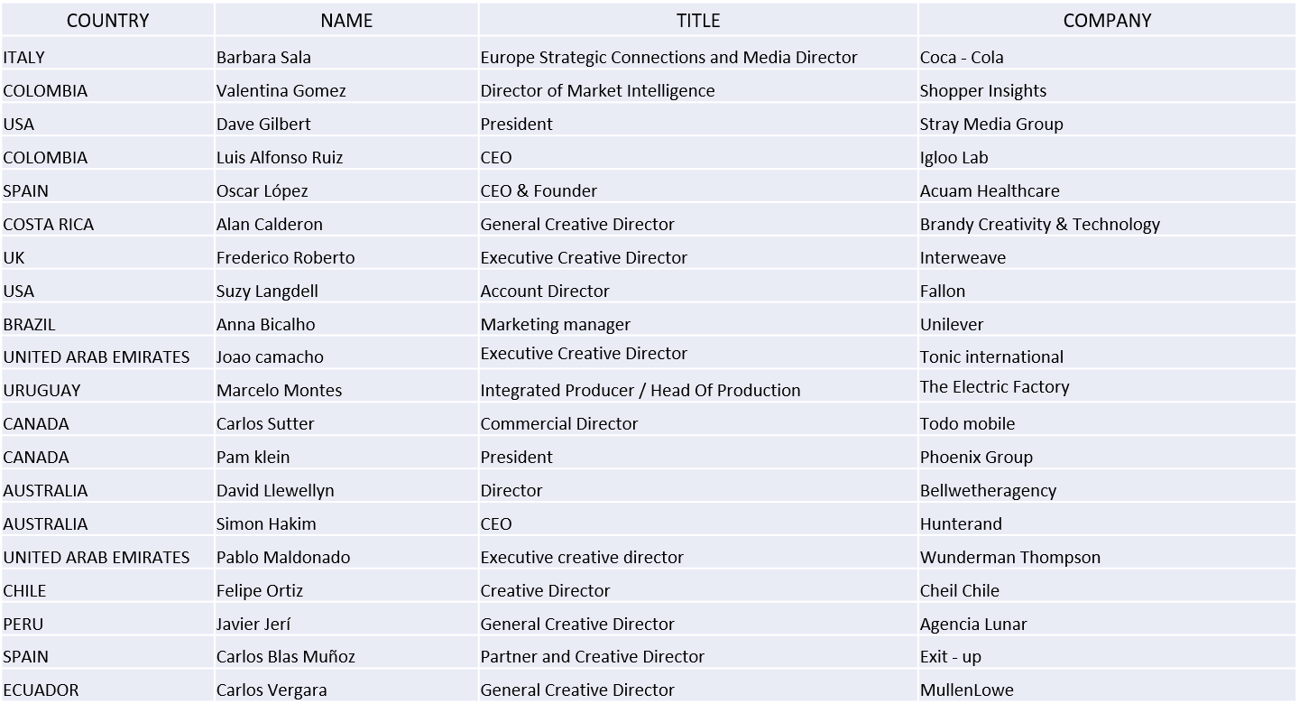 La organización WINA dio a conocer un nuevo grupo de 20 jurados internacionales para la edición 2021, para un total de 63 jurados confirmados hasta la fecha, quienes estarán juzgando las piezas el único festival mundial de publicidad para agencias y redes multinacionales independientes. Las inscripciones iniciarán este 29 de enero en winfestival.com